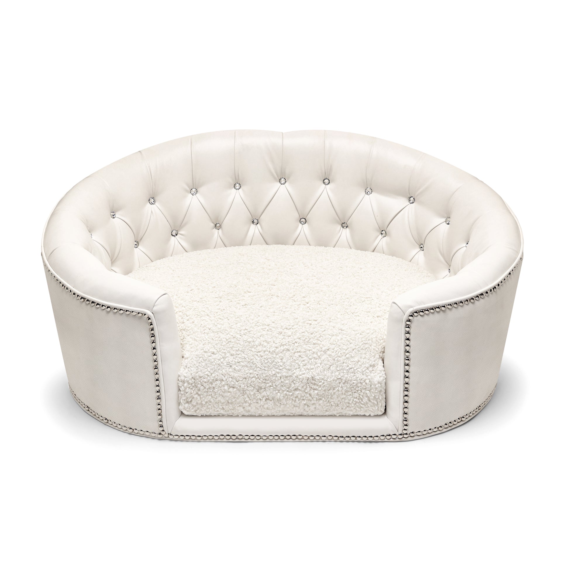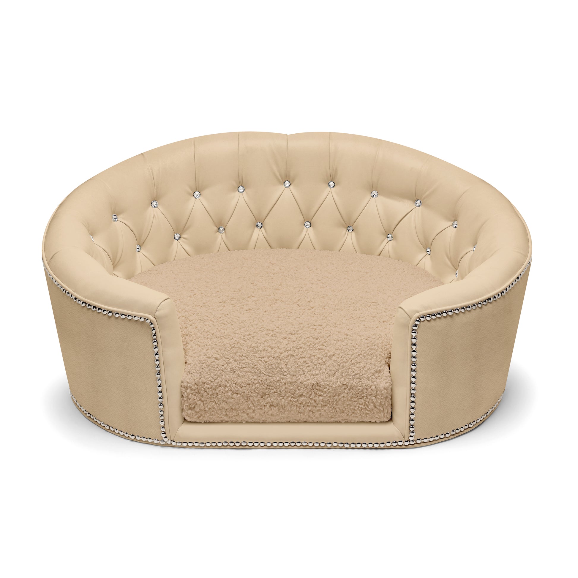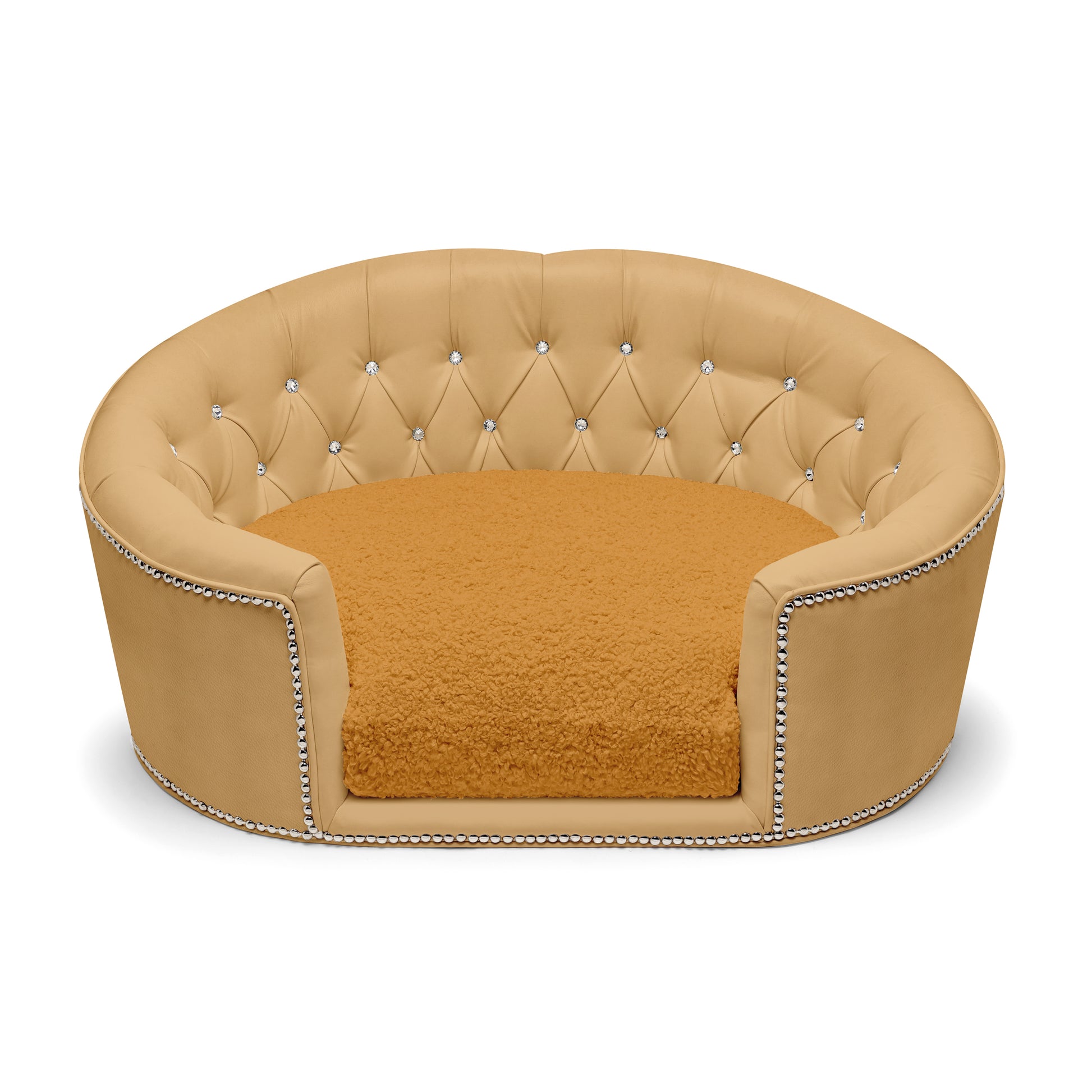 Designed for small pets with big personalities, this custom dog bed includes ultra-soft, reversible cushions filled with our exclusive “angel hair” blend — delivering the breathable bounce and cloud-like support pets love. Finished with hand-applied platinum or gold nailhead trim, every inch of this designer dog bed radiates Hollywood glamour.