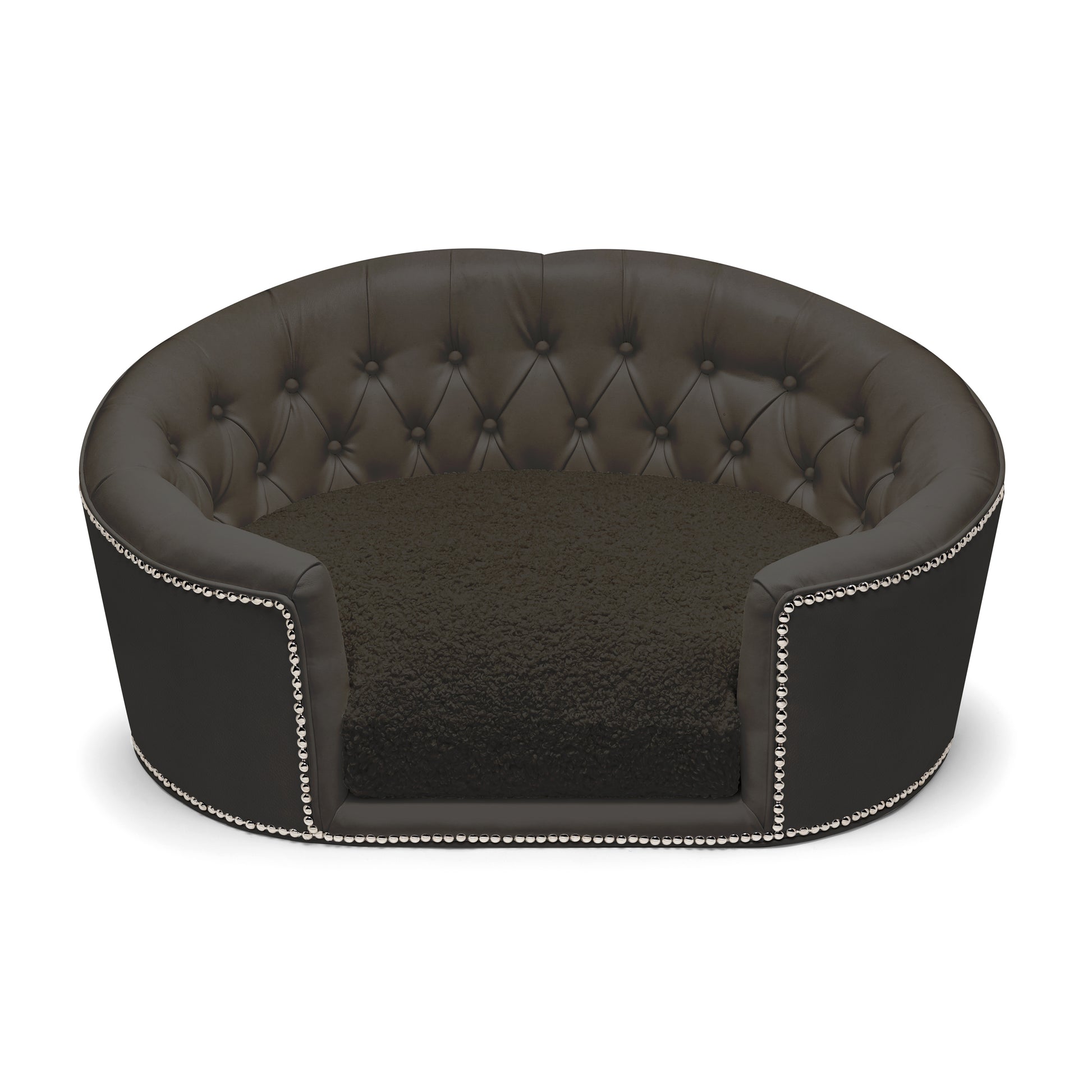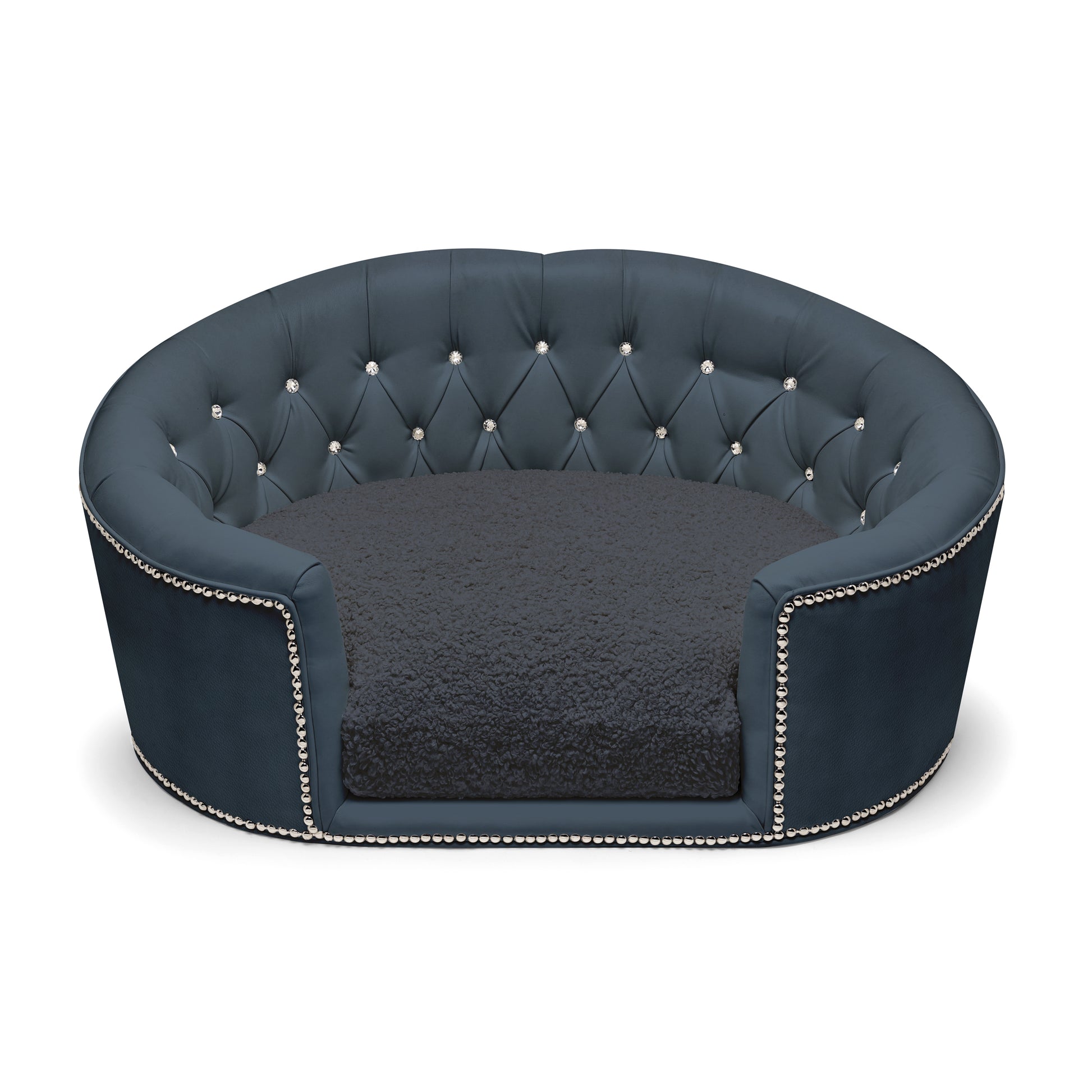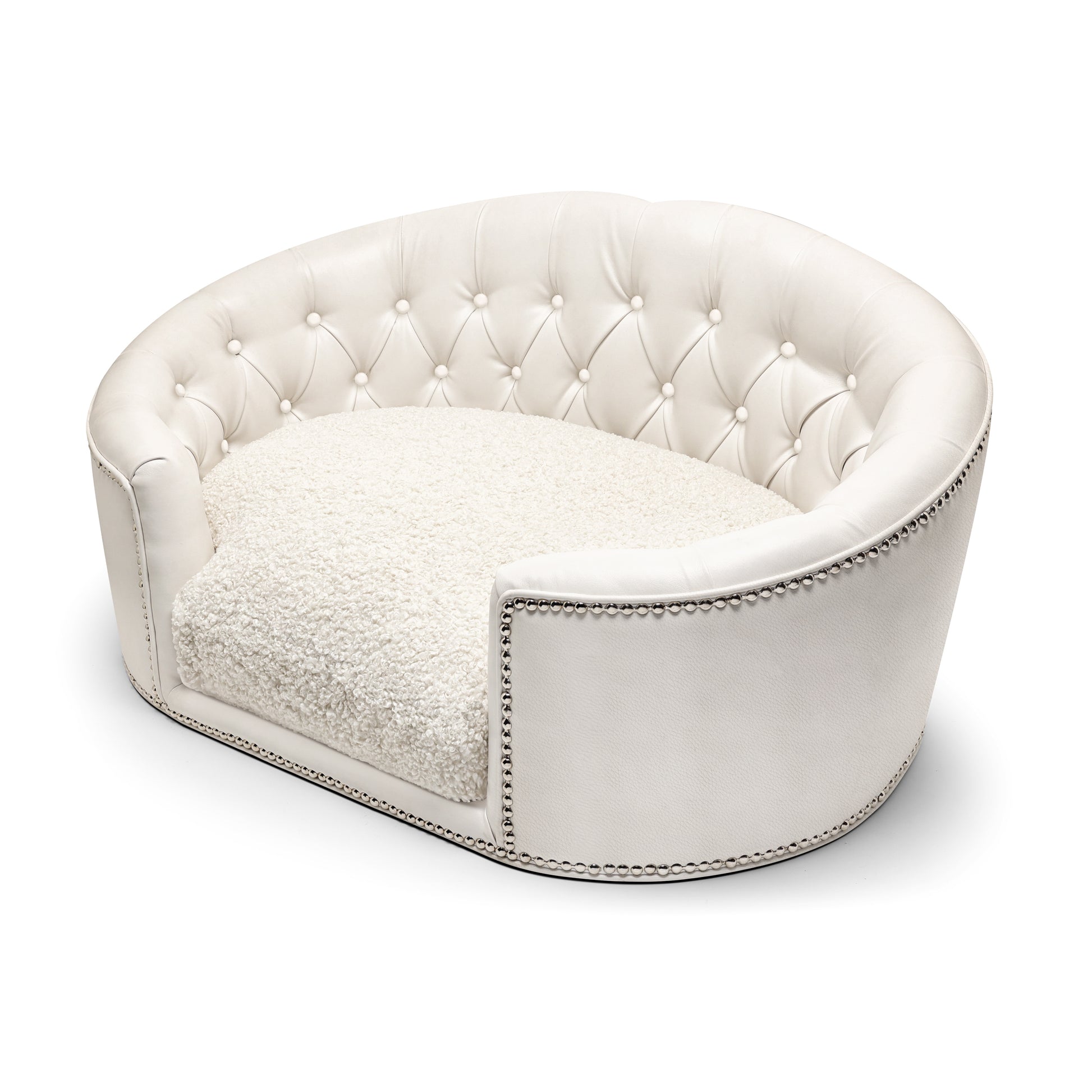 Designed for small pets with big personalities, this custom dog bed includes ultra-soft, reversible cushions filled with our exclusive “angel hair” blend — delivering the breathable bounce and cloud-like support pets love. Finished with hand-applied platinum or gold nailhead trim, every inch of this designer dog bed radiates Hollywood glamour.